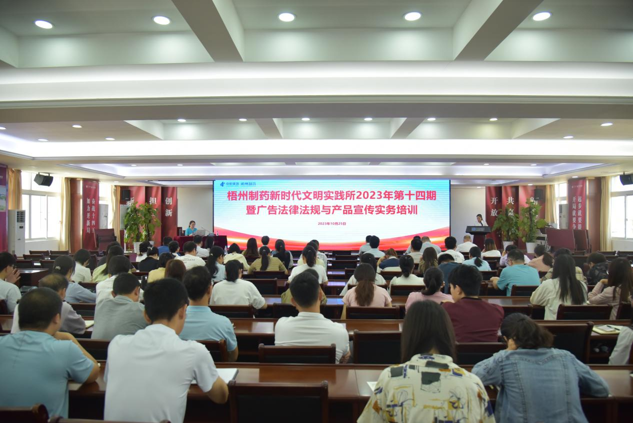 近日,梧州制藥在公司辦公樓六樓一號(hào)會(huì)議室舉辦新時(shí)代文明實(shí)踐所2023年第十四期暨廣告法律法規(guī)與產(chǎn)品宣傳實(shí)務(wù)培訓(xùn),特邀梧州市市場(chǎng)監(jiān)督管理局廣告監(jiān)督管理科科長(zhǎng)謝艷娟前來授課,梧州制藥各部門、各車間,以及集團(tuán)公司和各兄弟企業(yè)相關(guān)人員共計(jì)90余人參加培訓(xùn)。