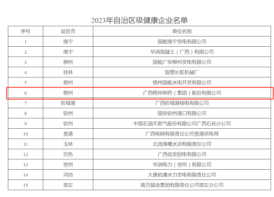 近日,廣西壯族自治區(qū)愛國衛(wèi)生運動委員會印發(fā)《自治區(qū)愛衛(wèi)辦關于公布2023年自治區(qū)級健康企業(yè)名單的通知》,其中,梧州制藥榜上有名,獲評“自治區(qū)級健康企業(yè)”稱號。
