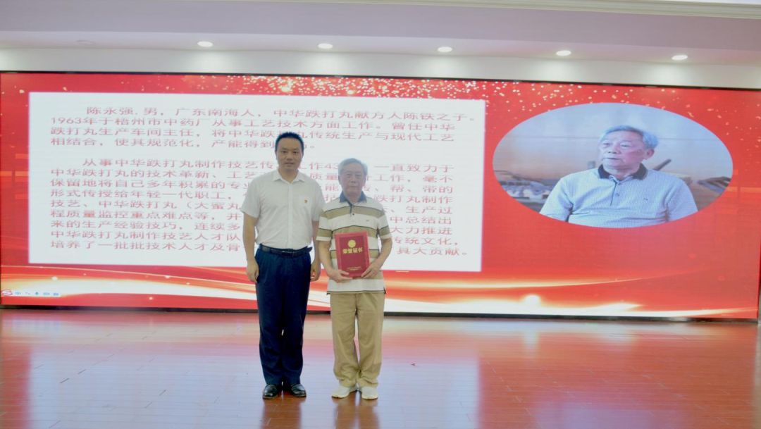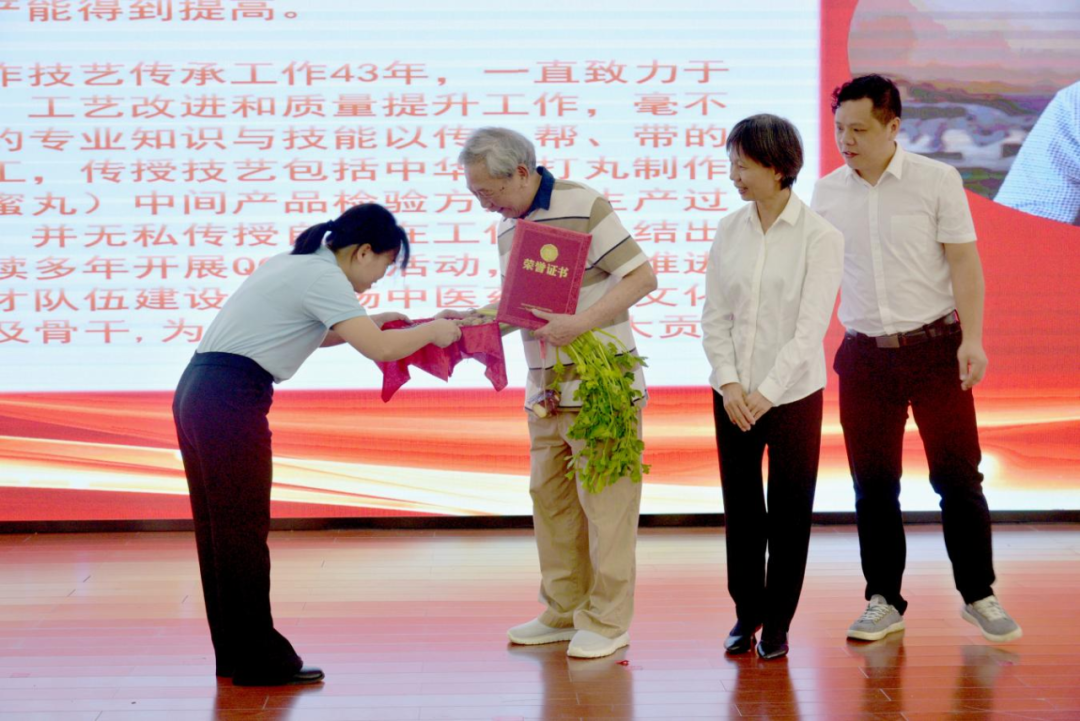 活動還專門邀請了中華跌打丸獻(xiàn)方人陳鐵的兒子,現(xiàn)已83歲高齡的原跌打丸生產(chǎn)車間主任陳永強(qiáng)到會,由公司黨委書記、董事長黃文彩為其頒發(fā)“中華跌打丸制作技藝——金牌師父”榮譽稱號。“中華跌打丸制作技藝”的第三、第四、第五代非遺傳承人依次上臺,同樣用傳統(tǒng)的束脩六禮對陳老進(jìn)行了謝師,以此來表達(dá)對師父的感激之情、教導(dǎo)之恩。
