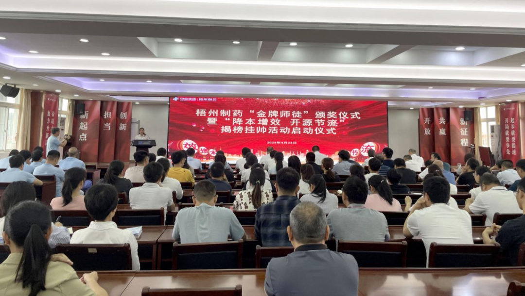 4月24日上午,一場感恩與奮進(jìn)的“金牌師徒”頒獎儀式暨“降本增效 開源節(jié)流”揭榜掛帥活動啟動儀式隆重舉行。梧州制藥領(lǐng)導(dǎo)班子成員,各部門、各車間職工代表,及獲評星級的“金牌師徒”共150余人參加活動。