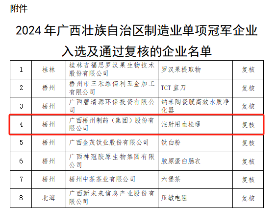 近日,廣西壯族自治區(qū)工業(yè)和信息化廳公布2024年廣西壯族自治區(qū)制造業(yè)單項(xiàng)冠軍企業(yè)名單,梧州制藥憑借著冠軍產(chǎn)品注射用血栓通卓越的技術(shù)能力和市場競爭力,順利通過了每三年一次的復(fù)核評價。