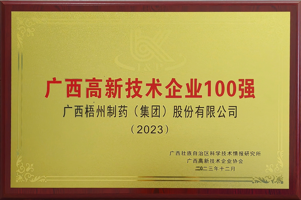 廣西梧州制藥(集團(tuán))股份有限公司獲評(píng)2023年廣西高新技術(shù)企業(yè)100強(qiáng)